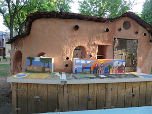 Program staff turned off the main water handle for the cob water supply. They added some plywood to block the pass-through so that kids can no longer reach around and turn the water on from inside the enclosure.