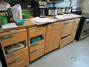 Recreation supervisor Keith Storey said he’s willing to discuss a proposal for three or four rotating cleaning-and-fixing bees that include de-greasing the walls and shelving, repairing drawers and cupboard doors, re-lining corroded shelving, etc.