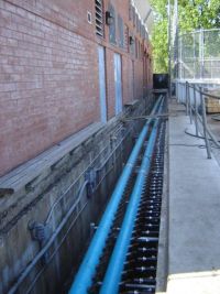 What's the surprise? Collectively, as taxpayers, we spend more than $500 a day at each rink to fuel the machinery that cools the rink pad. The rink compressors vary between 100 and 200 horsepower each. You can hear their noise through the compressor-room doors at the sides of the buildings. At most of the rinks a brine (salt water) or glycol solution is pushed through a big tank of cooling ammonia, and then out into the extensive grid of PVC pipes underneath the concrete floor of the rink. The cold liquid brings the entire big concrete slab to well below freezing, so any water that's put on the surface of the rink pads sets up as ice right away. When the brine in the pipe grid warms up from transferring the cold to the slab, the liquid circulates back into a large pipe in the "header trench" right next to the building, underneath where everybody stands when the zamboni is doing ice maintenance. From there the brine gets pushed back into the machinery room, where it passes through the freezing-cold ammonia tank, and out again into the pipes under the concrete, and so on.