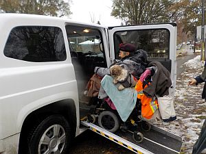 At about 10 a.m. on Monday November 18, Russell from Streets to Homes pulled up with an accessible van, by appointment, beside Toni Corrado’s outdoor encampment at the cob courtyard. Brent from the Shelter, Support and Housing Administration (SSHA), had already been there since before 9, bringing Toni a coffee and helping with last minute tasks. Toni hooked a few more bags to the back of her electric wheelchair. Her two little Shi Zhu dogs, Harry Potter and Booboo, jumped up on her lap, and Toni drove her chair up the ramp into the van, to move in to her new rent-geared-to-income bachelor apartment in the east end, at last.