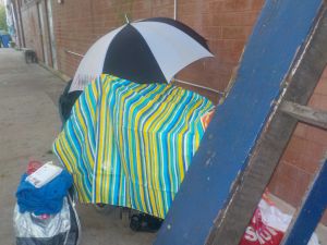 In the CELOS-funded shed by the wading pool, where Toni has been able to store some of her belongings, she found two city-issued sun umbrellas that the wading pool staff had left behind at the end of the summer. She moved the umbrellas over to the cob, opened them up and propped them to make a wind barrier and to anchor the lower side of the tarp.