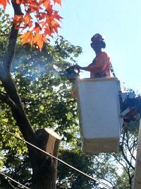 Last year four very large trees came down during two wind storms. So far this year it’s only been branches. Two days later the city’s forestry inspector came out to the playground area and marked a number of branches and one big tree. A week later, contractors drove into the park with their cherry pickers and their chippers and cut it all. (Toni Corrado captured it all on her cell phone, from her temporary shelter and vantage point at the cob courtyard.) Done.