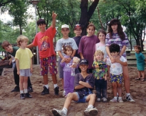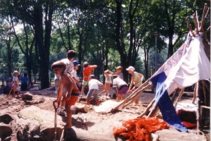 In 1993, at an April community meeting, an old-fashioned sand play area was proposed for Dufferin Grove (using a $25,000 donation from the Dufferin Mall, which also included some money for a few artists to work with the kids, and a new basketball court). Some of the immediate park neighbours were not happy about the sand pit idea. They said they didn’t want more activity in the playground, it was already noisy enough, with the wading pool and the existing playground structure. But the very hands-on Recreation director at the time, Mario Zanetti, came to the park himself, to make a pitch. He got up on a picnic table in front of the crowd and asked the opposition to give the sand play area a chance. One by one, parents from the neighbourhood came forward to the picnic table and spoke in support of his request. The immediate neighbours agreed to suspend their opposition, and the adventure playground got its start.
