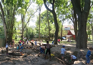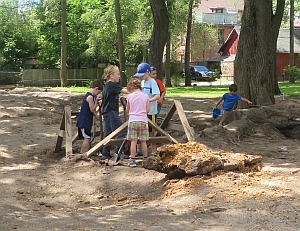 A sandpit was proposed because it was big, and cheap, and fast to install. To build it, we needed a City backhoe driver to dig out an area 20 x 40 feet, to about 15 inches deep, and fill it with gravel for drainage, then add four truckloads of sand piled overtop, then logs to surround it, and some branches and shovels for the kids to start working. There was ample space for this sand play area, right beside the wading pool. Simple! But then the plan began to run into trouble. The month of May came and went, and the weeks ticked by into June, and still no backhoe arrived to start making the sandpit. We learned something important. In a big city, the government might say yes, yes, yes to local ideas, but nothing might ever actually happen.