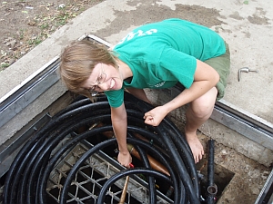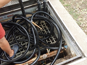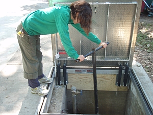 1. Water turn-on: A trap door will be cut into the water turn-on pit before June 26 (start of pool season). The valve attachment will be relocated so it's in line with the trap door. That means there's no need to modify the T-key that opens the valve.