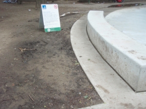 In addition, we talked to the plumber about the muddy area behind the water-spray feature, cause by all the back-spray. This muddy water then runs back into the pool, requiring staff to add more chlorine, to compensate. At times they even need to drain the pool and start over. The plumber agreed that putting extra concrete in that area would help, and said he'd look into it.