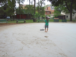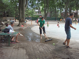 The staff try to sweep the mud away but even so, they have to drain and refill the pool in mid-day, because there's too much leaking of mud. The mud breaks down the chlorine very fast. This has a simple solution -- broaden the apron of paving behind the spray barrier.