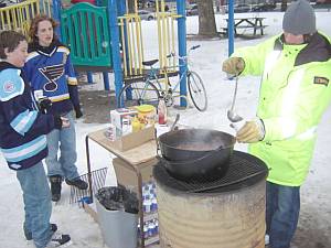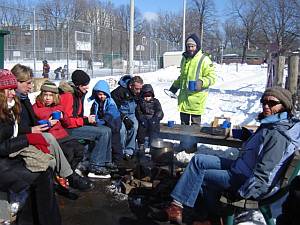 This was a party for a kid whose mother was one of the group of three who got the sand pit into the park, back in 1993. She has been having a rink birthday party for her son each year for six years now. There was always a campfire, which they always shared with all rink users. This year the mother heard the campfires were cancelled, so they didn't make any arrangements ahead. When they got there, the group were thrilled to hear that temporary permission has been restored. So the staff sent an e-mail and lit the campfire. Everyone was happy, including the other rink users who joined in.