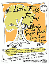 The Little Folk Festival is made possible through the support of the Friends of Dufferin Grove and the park staff; the many volunteers, including all the musicians; the generous support of local businesses: Long and McQuade, Front Door Organics, Goo Factory Design and Kwik Kopy Printing. The event is FREE but donations are very welcome - expect a hat to be passed your way!