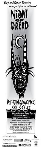 "Night of Dread is an INVITATION to the community, both near and far, to parade our private and collective fears through the streets of Toronto and to laugh at them, mock them, to name them, and to burn their names in a big bonfire, to waltz with Death, to eat the bread of the dead and to remember those who have gone from our midst."