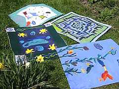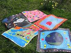 The children will learn how to prime a piece of artist's canvas; we'll then discuss various aspects of surface design ( textiles), and the kids will create their own "floor art" using acrylic paints. Wear something you don't mind getting covered in non-washable paint !! We'll provide juice and cookies halfway through the afternoon, and hopefully we'll be able to work outdoors on the grass.