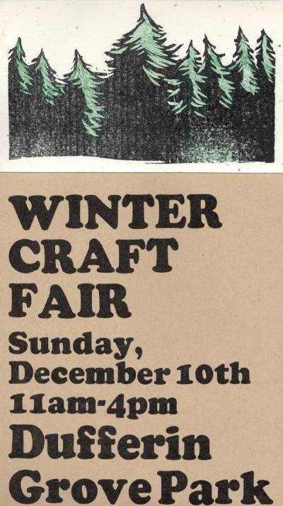 From neighbourhood crafter Abbey Huggan: “Calling all Dufferin Grove craftspeople and artists! No previous craft fair experience necessary! Come out and brave the weather and sell your wares under the new market awnings around the rinkhouse... table rates will be very reasonable.”