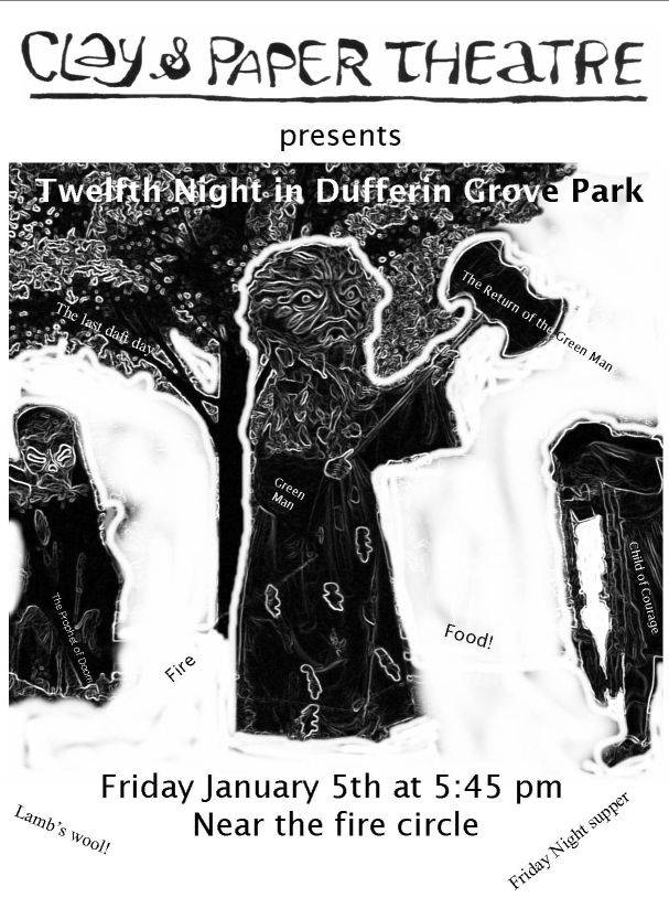 David Anderson’s Clay and Paper Theatre will present THE RETURN OF THE GREEN MAN, as the mummer’s play, with giant puppets. There’s a call for more volunteer mummers. David writes: “The show can be performed with as few as 8 actors, but benefits tremendously from having as many as 20 (or more!) performers. We need you. Please call 416 537-9105 or talk to the park staff. Volunteer now! There will be ONE rehearsal only, the night before in the gymnasium of the Wallace Emerson Community Centre. We have the rehearsal space booked for 2 short hours, from 8:30pm to 10:30 pm on Thursday January 4th.”
