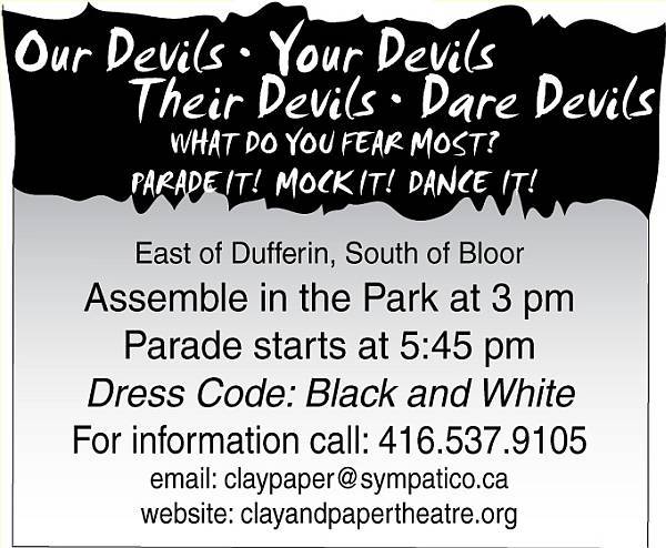 Saturday October 25 2014: Clay and Paper Theatre presents the 15th annual Night of Dread, which gathers participants together to wander the streets of Toronto in the spirit of banishing fears. 4pm - Participants begin assembling in Dufferin Grove Park. 6pm - Parade begins 7:30pm - Parade returns to DGP for pageantry and celebration.