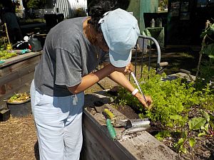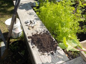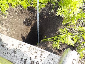 The fog is starting to clear for the garden plots. It turns out that the gardeners saw city workers fill the boxes with bagged triple-mix, but they didn't have enough. So they seem to have scraped out some soil and rubble from their yard or somewhere -- at least, it arrived in a truck. This morning the gardeners did a cone sample/archeological dig :) and found that indeed the soil is okay below about three inches.